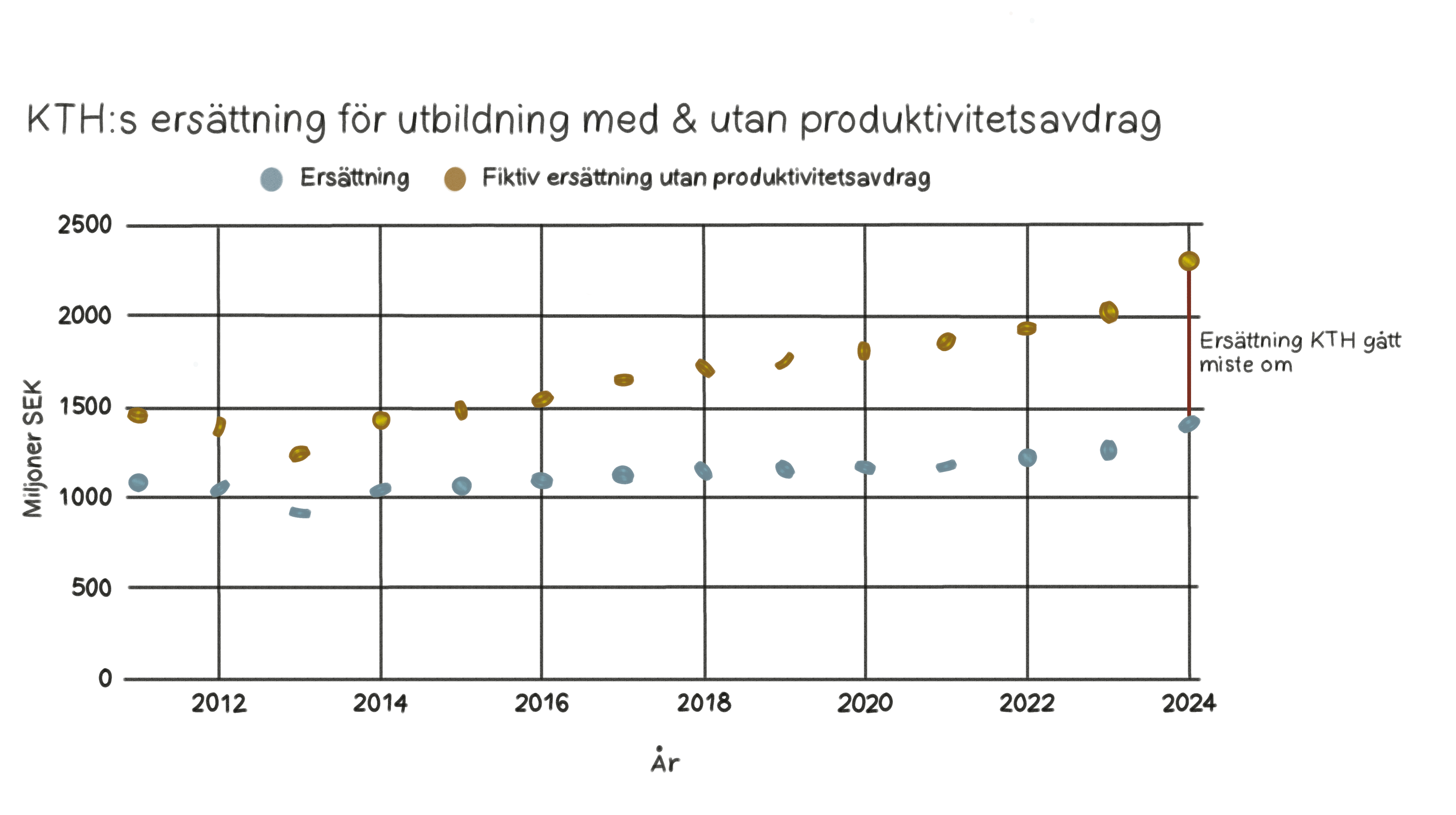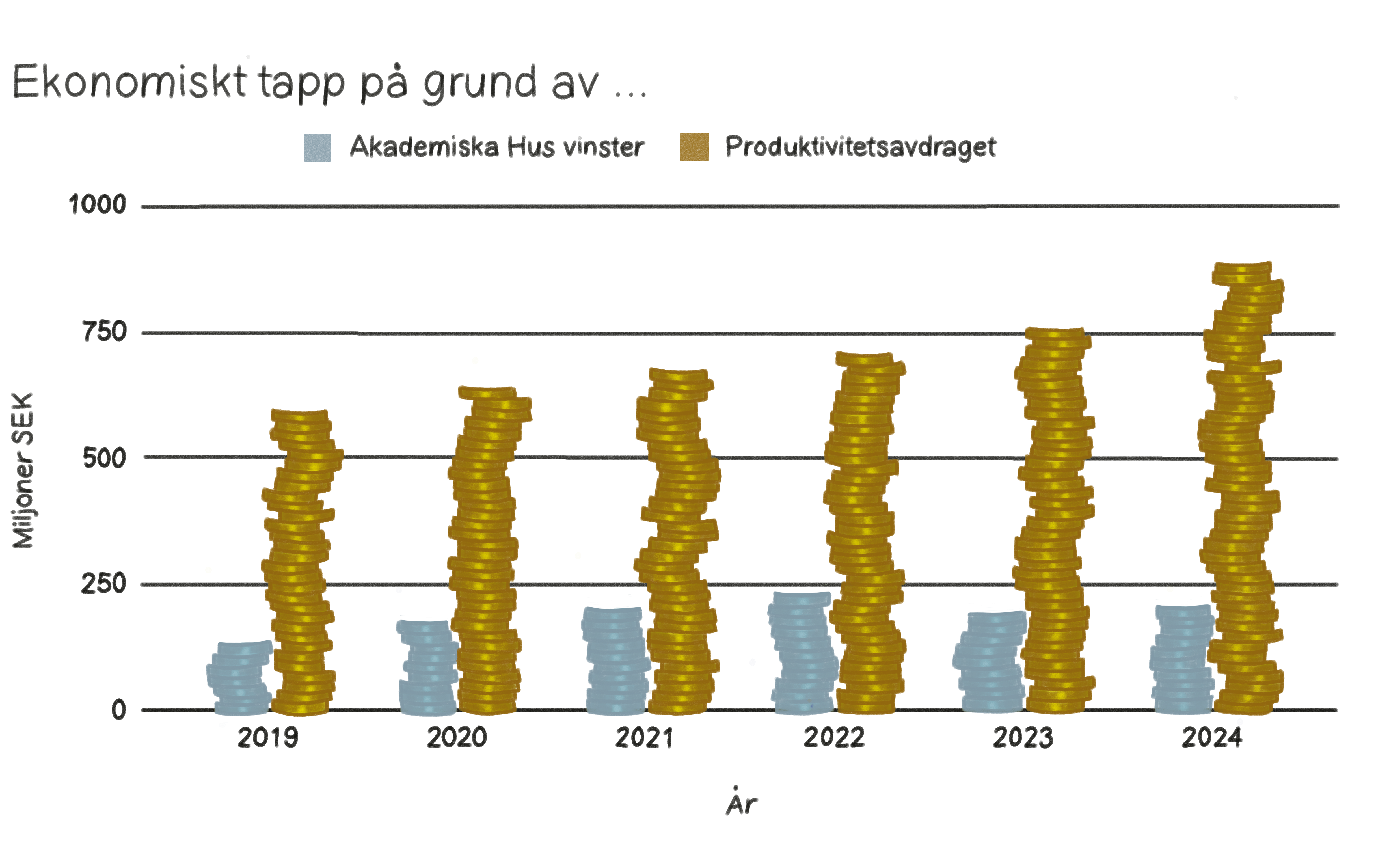 Men vilket av problemen kostar KTH mest, de höga hyrorna eller produktivitetsavdraget? Mellan 2019 och 2024 betalade KTH 4,6 miljarder kronor till Akademiska Hus. Om man sedan antar att Akademiska Hus tar ut lika stor procentuell vinst för alla hyresgäster, så skulle KTH ungefär “tjäna” 1,2 miljarder kronor ifall Akademiska Hus slutade med vinstutdelning helt och istället minskade lokalhyrorna med lika mycket. Under samma tidsperiod gick KTH miste om ungefär 4,3 miljarder kronor som konsekvens av produktivitetsavdraget.